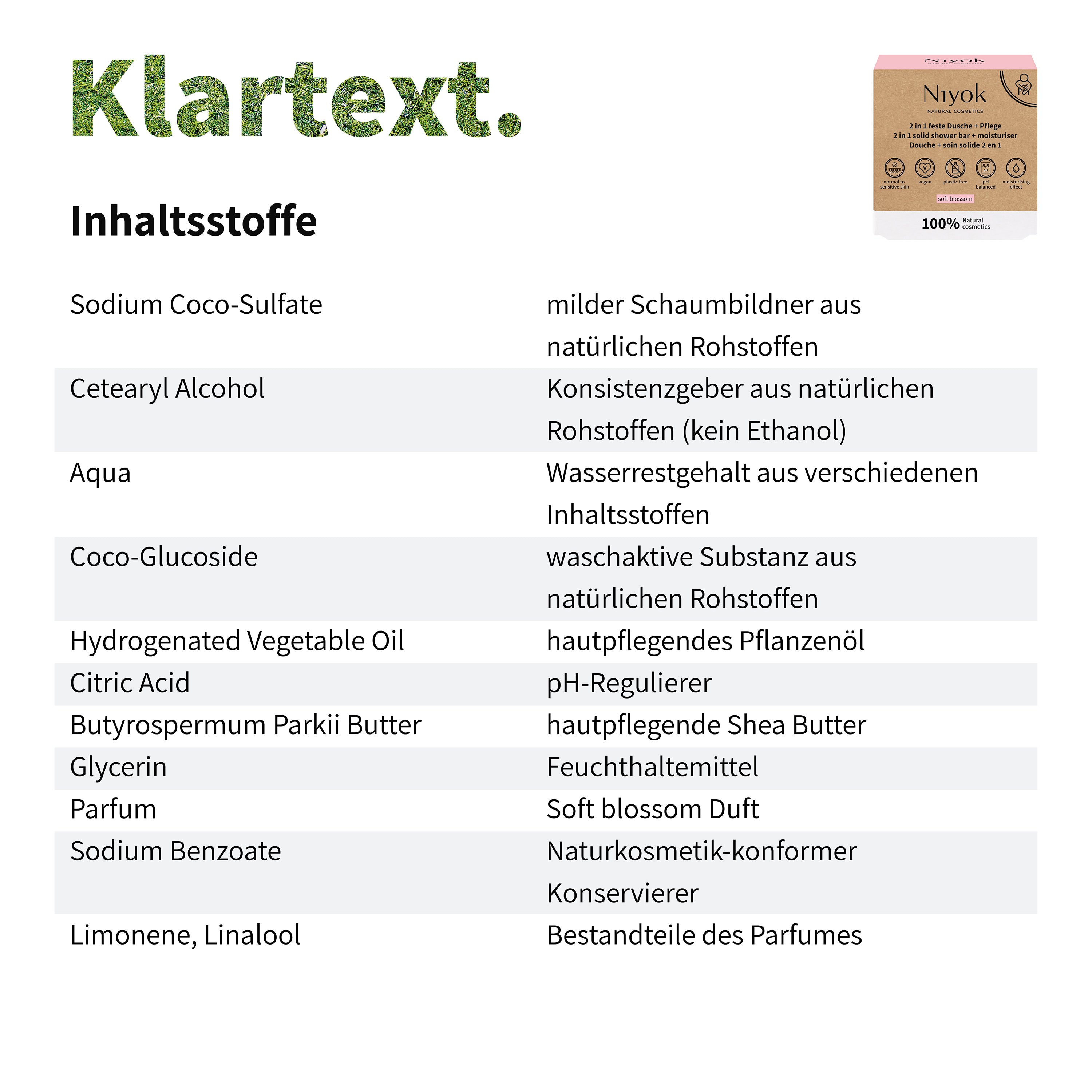 Zertifizierte und vegane Inhaltsstoffe. Ohne PEGs oder Mikroplastik.