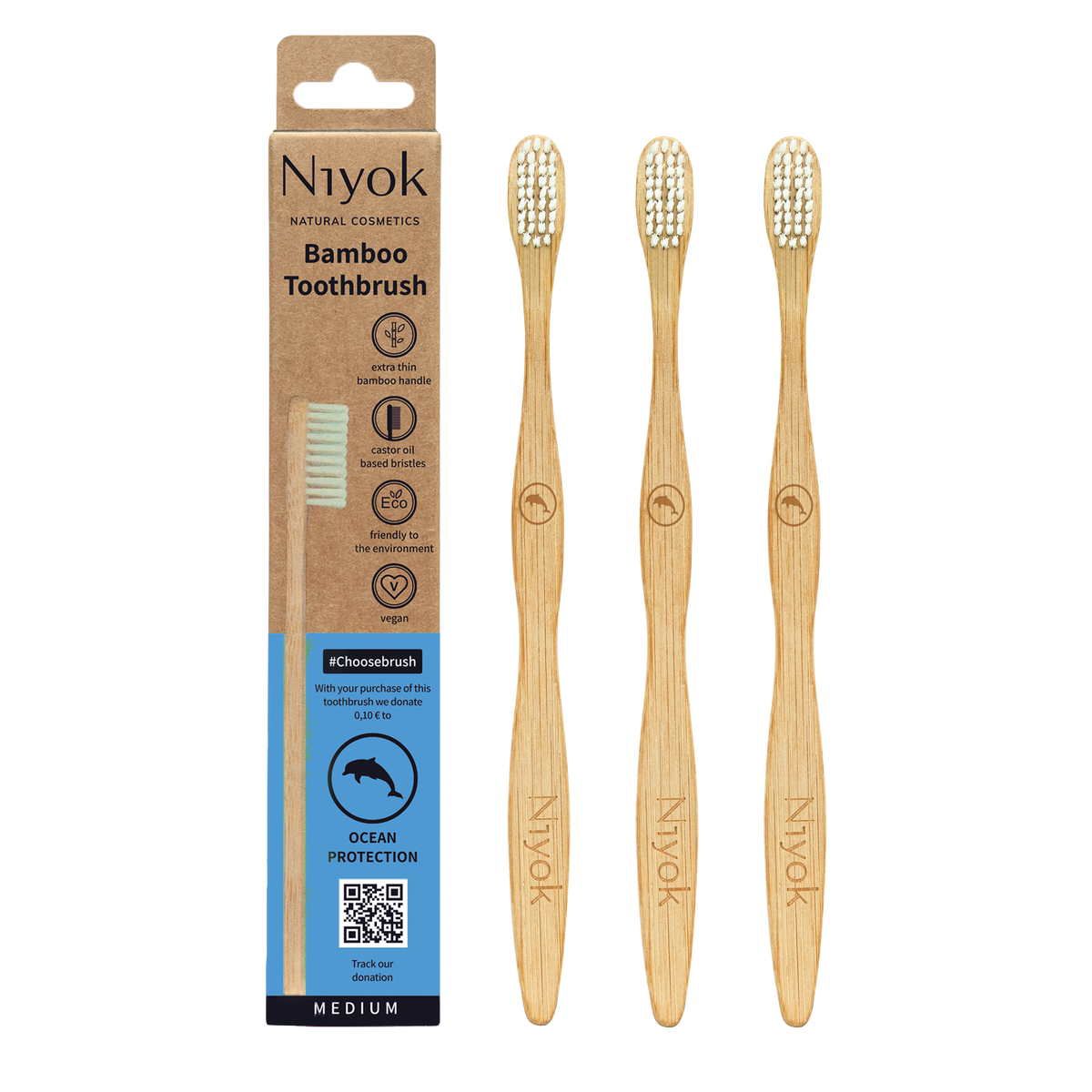 Die Zahnbürste selbst besitzt Borsten auf Rizinusölbasis und einen dünnen, nachhaltigen Bambusgriff. Zudem ist sie 100% vegan.