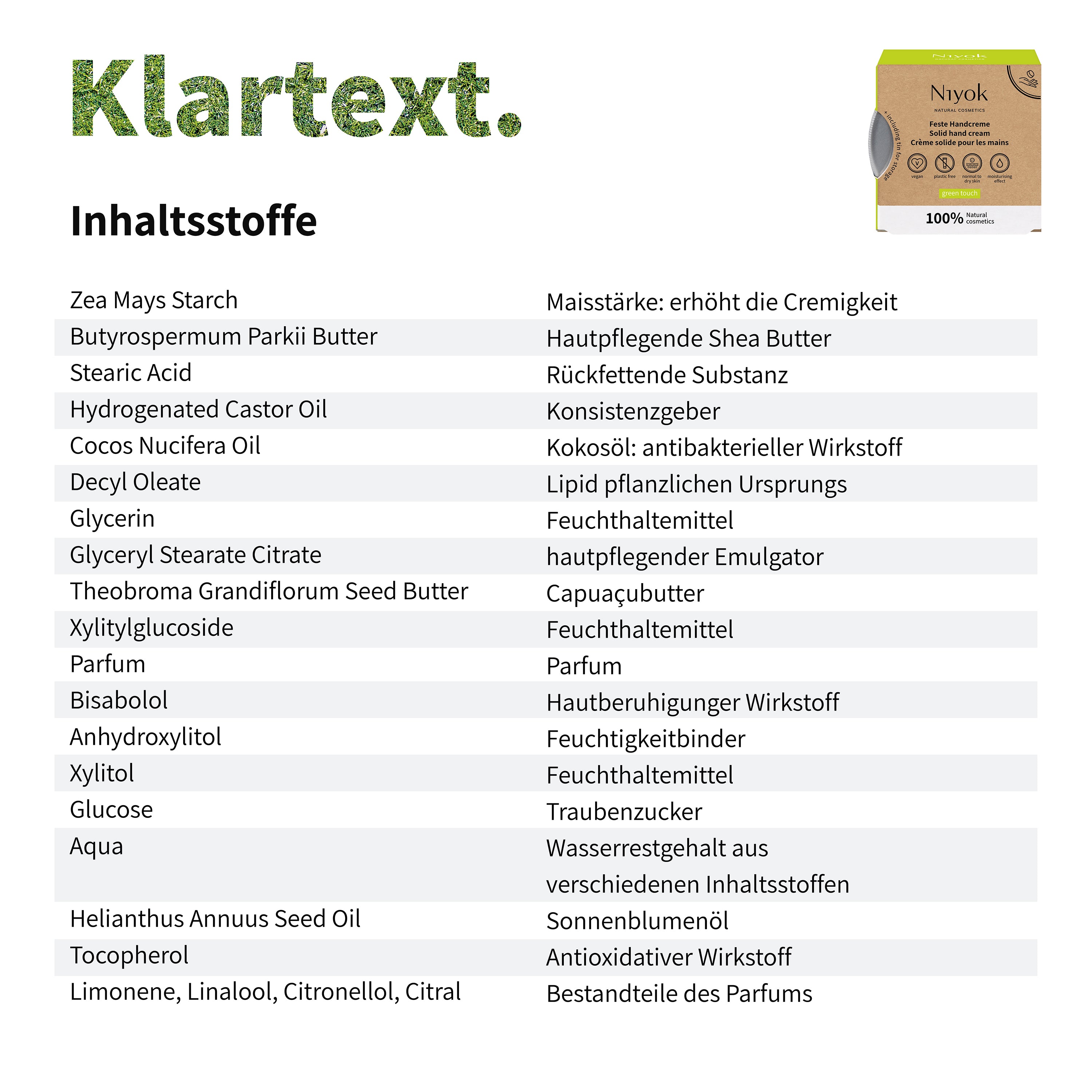 Zea Mays Starch, Butyrospermum Parkii Butter, Stearic Acid, Hydrogenated Castor Oil, Cocos Nucifera Oil, Decyl Oleate, Glycerin, Glyceryl Stearate Citrate, Theobroma Grandiflorum Seed Butter, Xylitylglucoside, Parfum, Bisabolol, Anhydroxylitol, Xylitol, Glucose, Aqua, Helianthus Annuus Seed Oil, Tocopherol, Limonene, Linalool, Citronellol, Citral