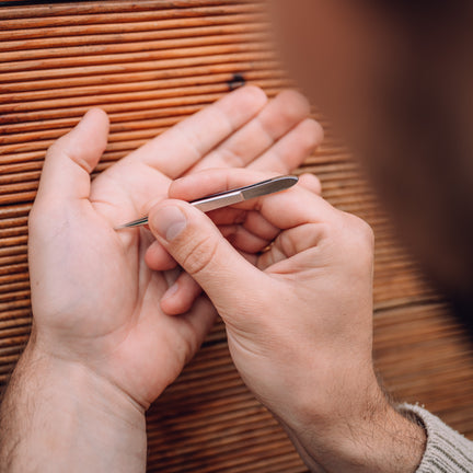 Die Splitterpinzette besitzt eine höchst präzise Spitze, die sich hervorragend zum Entfernen von Splittern in den Fingern und eingewachsenen Haaren am Körper eignet. Selbst kleinste Splitter können damit entfernt werden. Die handgefertigte, abgeschliffene Pinzette liegt angenehm in der Hand und besteht aus hochwertigem, recyceltem C45 Stahl mit nickelfreier Oberfläche.