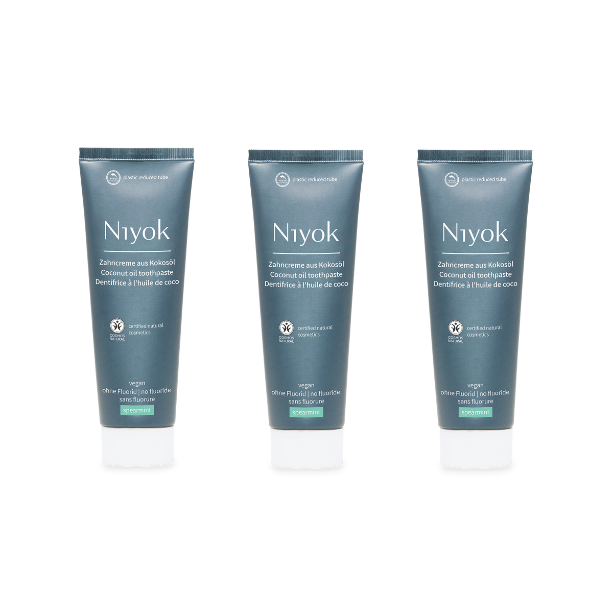 Für alle, die es frisch mögen – aber nicht auf natürliche Milde verzichten wollen. Unsere Spearmint Zahncreme ist die etwas kräftigere Schwester der klassischen Niyok Zahnpasta. Der Geschmack? Wie dein liebster Kaugummi – nur natürlicher. Eine kühle, belebende Frische, die dich durch den Tag begleitet, ohne zu brennen oder zu reizen. Im Herzen der Formel steckt hochwertiges Bio-Kokosöl – bekannt für seine antibakterielle Wirkung und seine Fähigkeit, den Mundraum sanft zu pflegen. Unterstützt wird es von einem remineralisierenden Wirkstoffkomplex, der deine Zähne gründlich reinigt und durch Xylit aktiv vor Karies schützt. Ideal auch bei empfindlichem Zahnfleisch oder schmerzempfindlichen Zähnen: Unsere sanften Putzkörper und milden Schaumbildner reinigen effektiv – ganz ohne aggressives Kratzen oder unnötig viel Schaum. Für ein rundum gutes Mundgefühl – vom ersten Moment an.